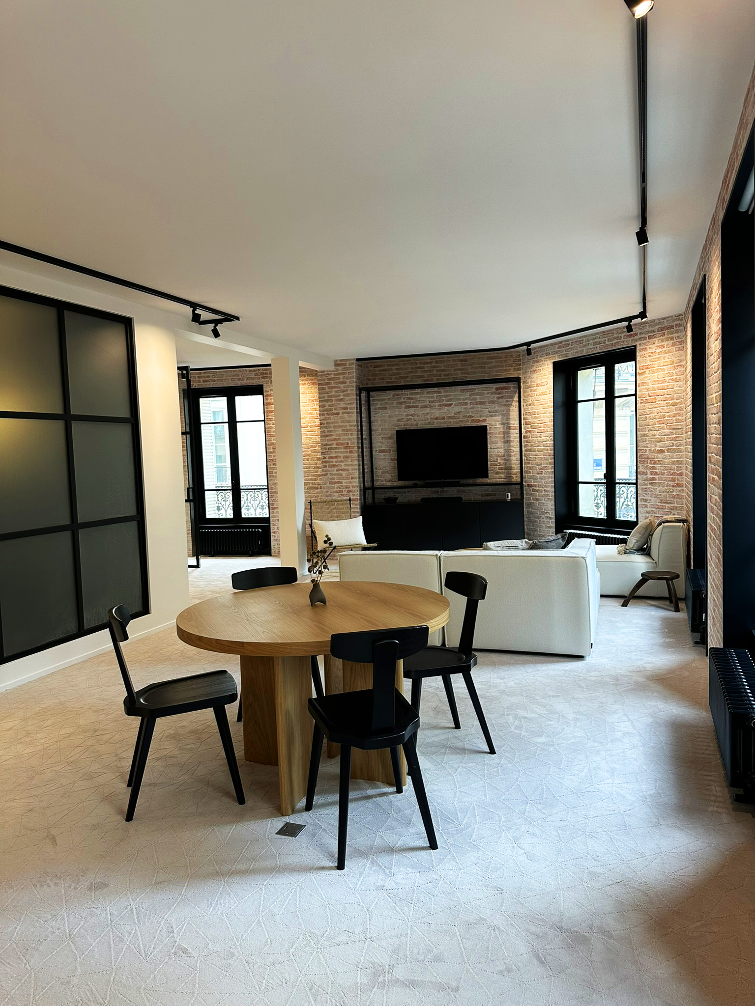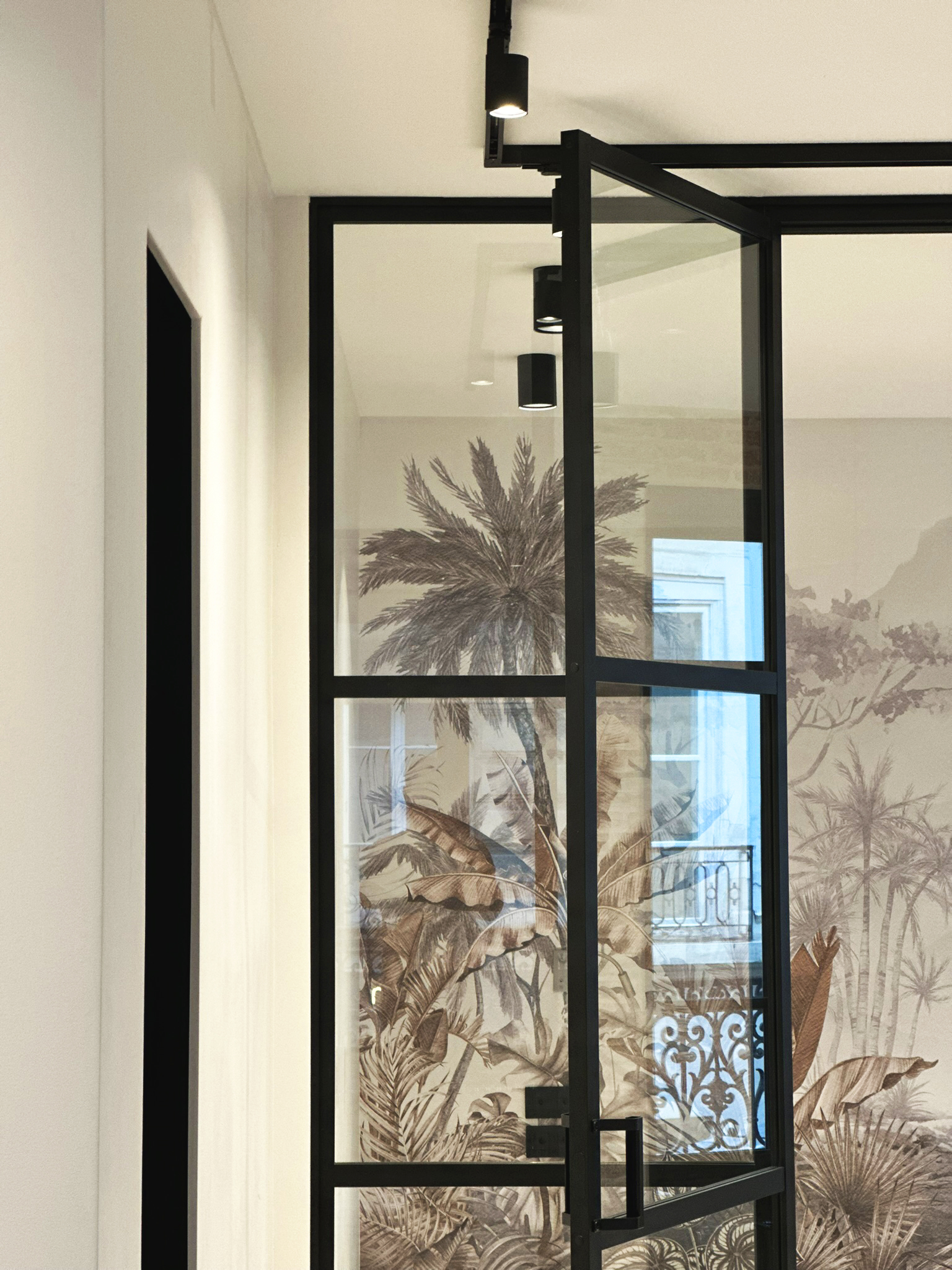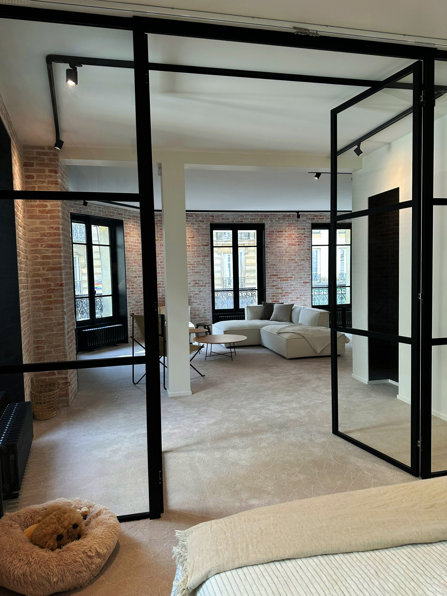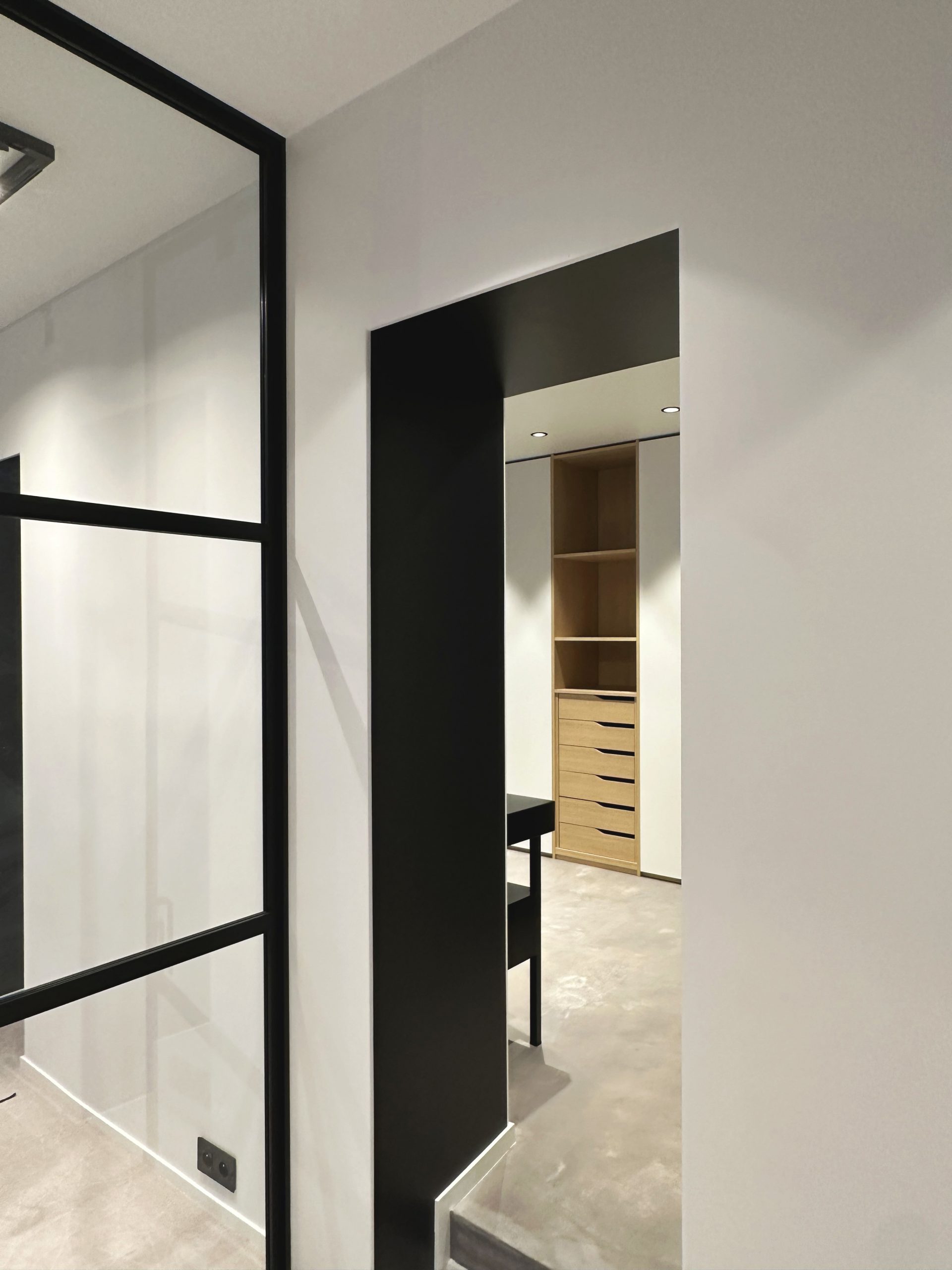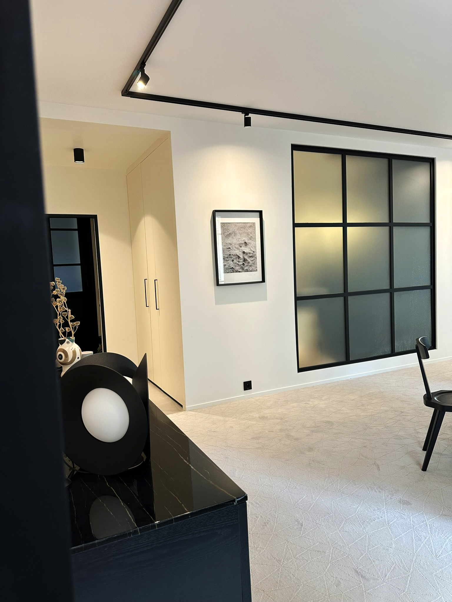Ce projet mise sur un contraste subtil entre les encadrements noirs des fenêtres et des verrières et la luminosité enveloppante de l’appartement. Les fenêtres et verrières aux cadres sombres créent une dynamique visuelle marquante, structurant l’espace tout en laissant entrer une abondante lumière naturelle.