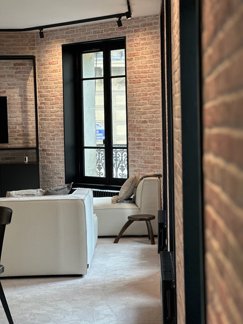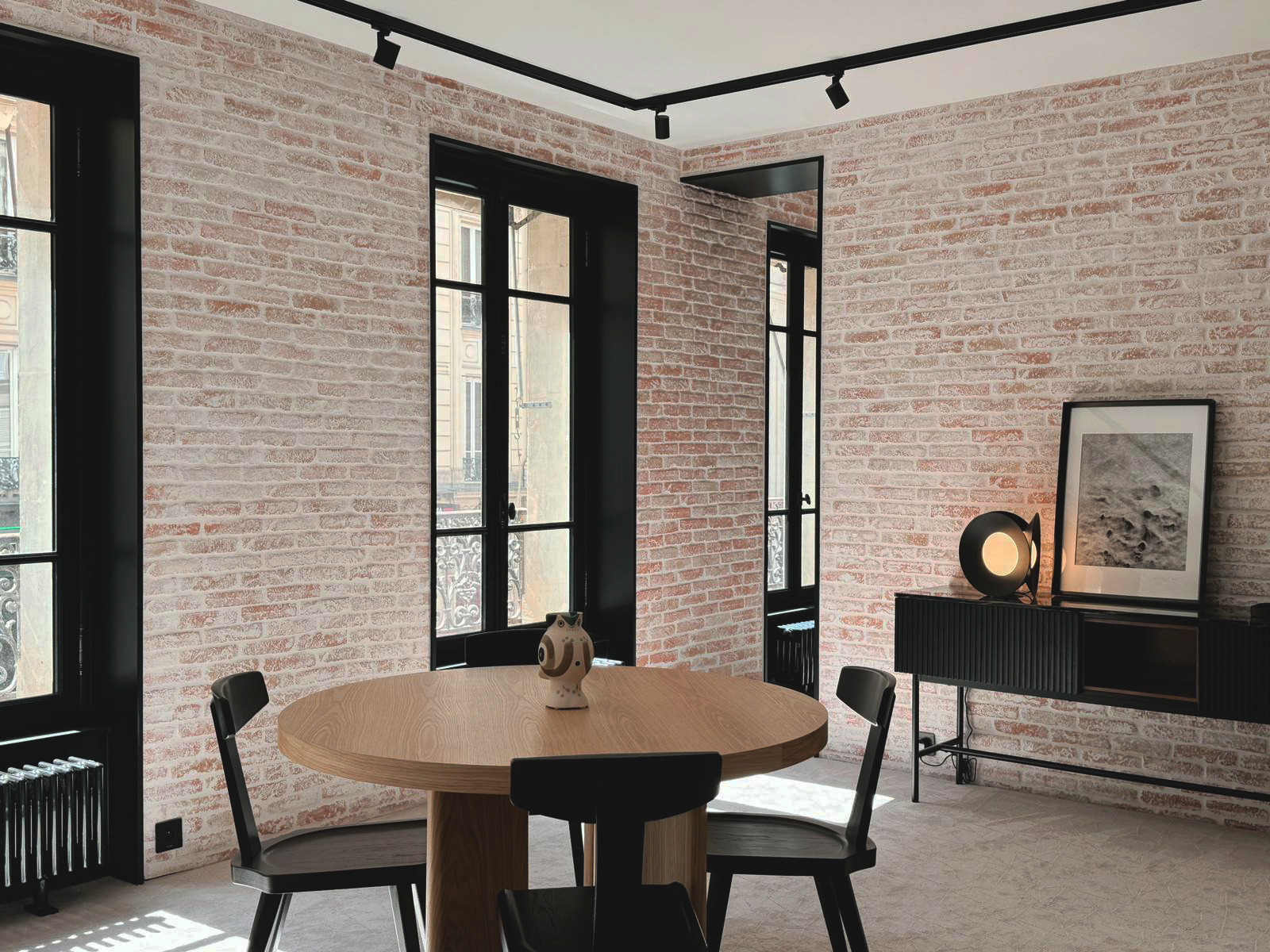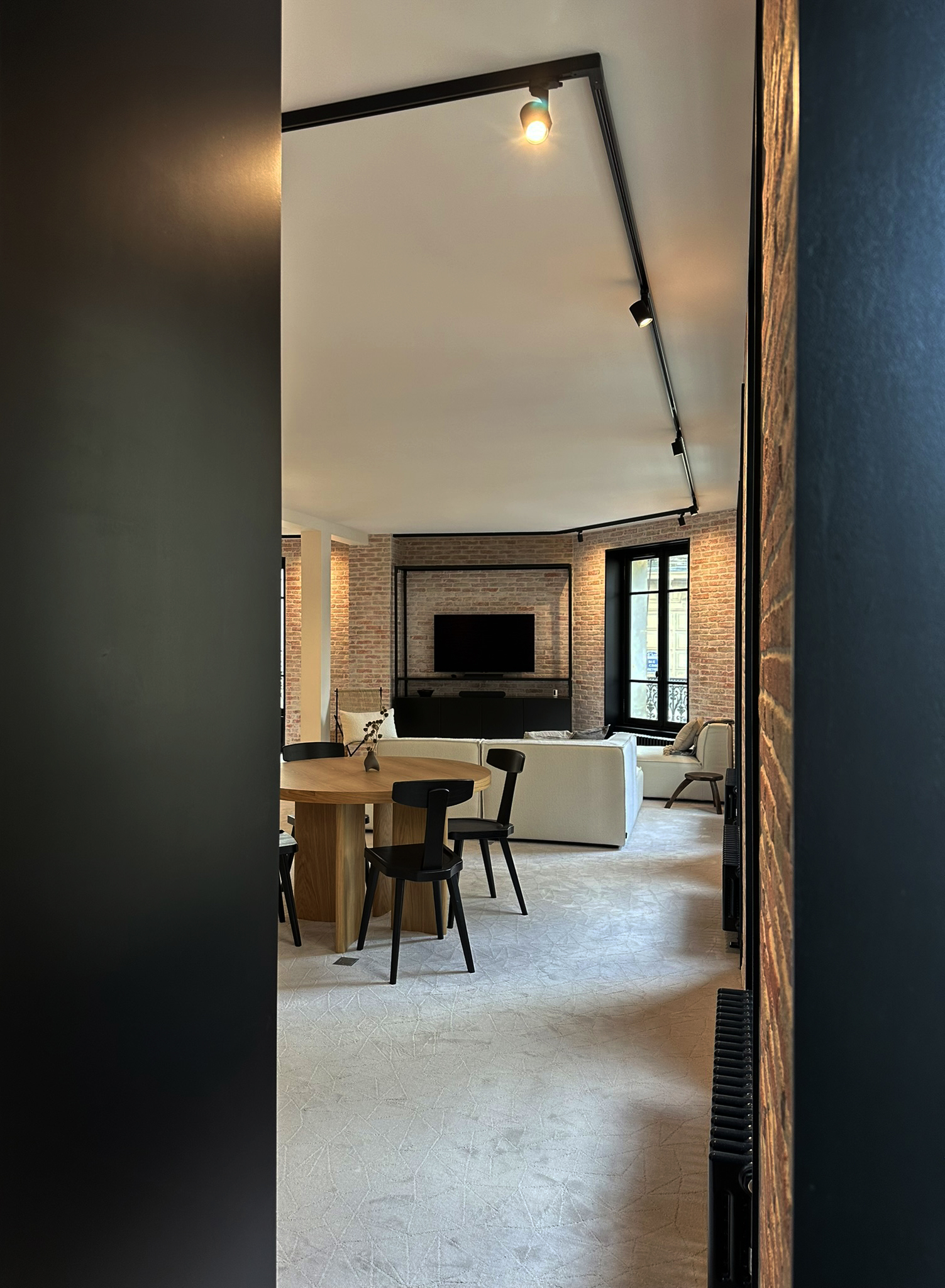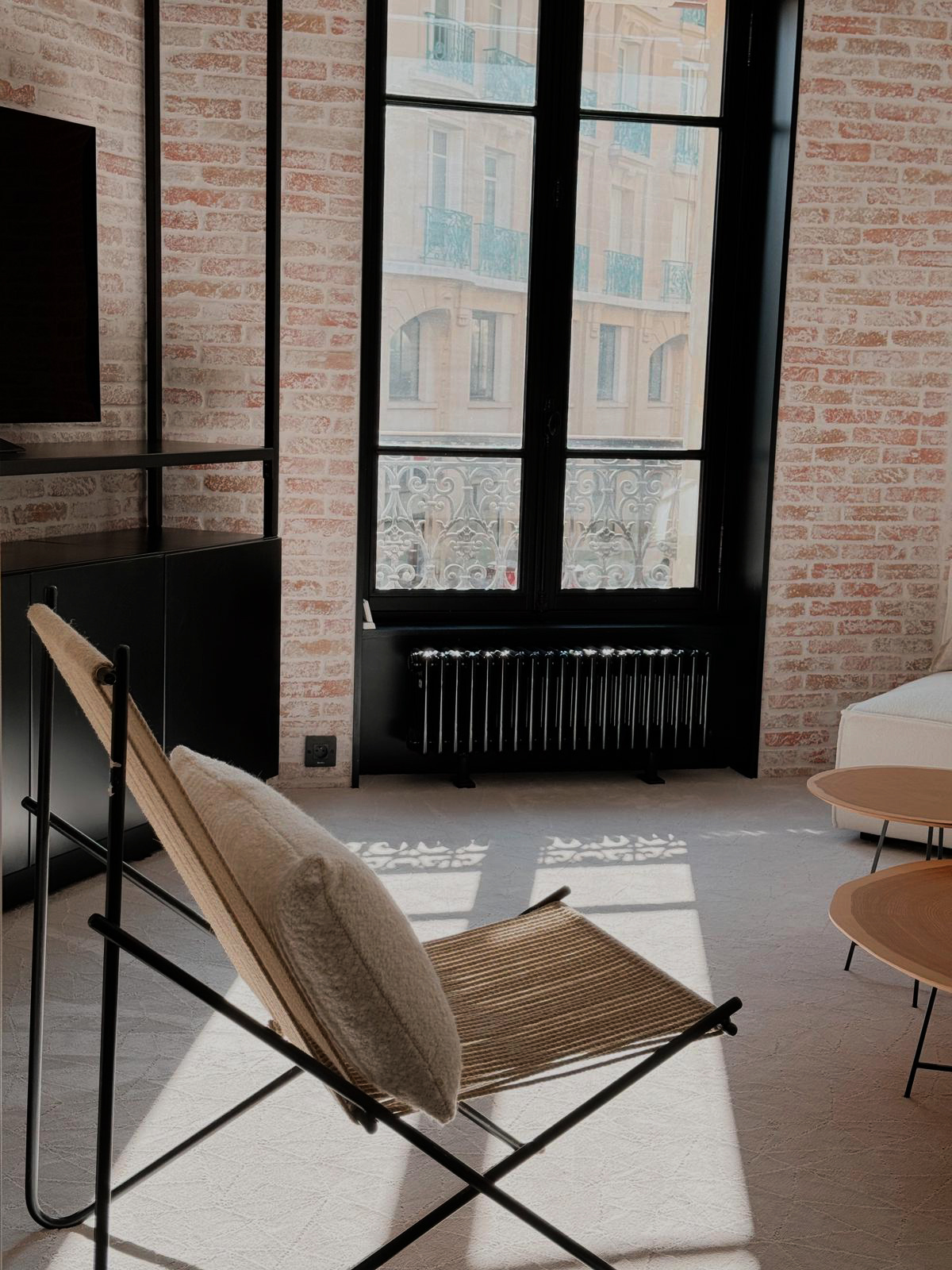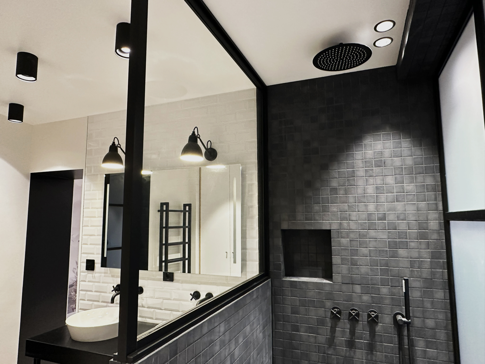 Ce projet mise sur un contraste subtil entre les encadrements noirs des fenêtres et des verrières et la luminosité enveloppante de l’appartement. Les fenêtres et verrières aux cadres sombres créent une dynamique visuelle marquante, structurant l’espace tout en laissant entrer une abondante lumière naturelle.