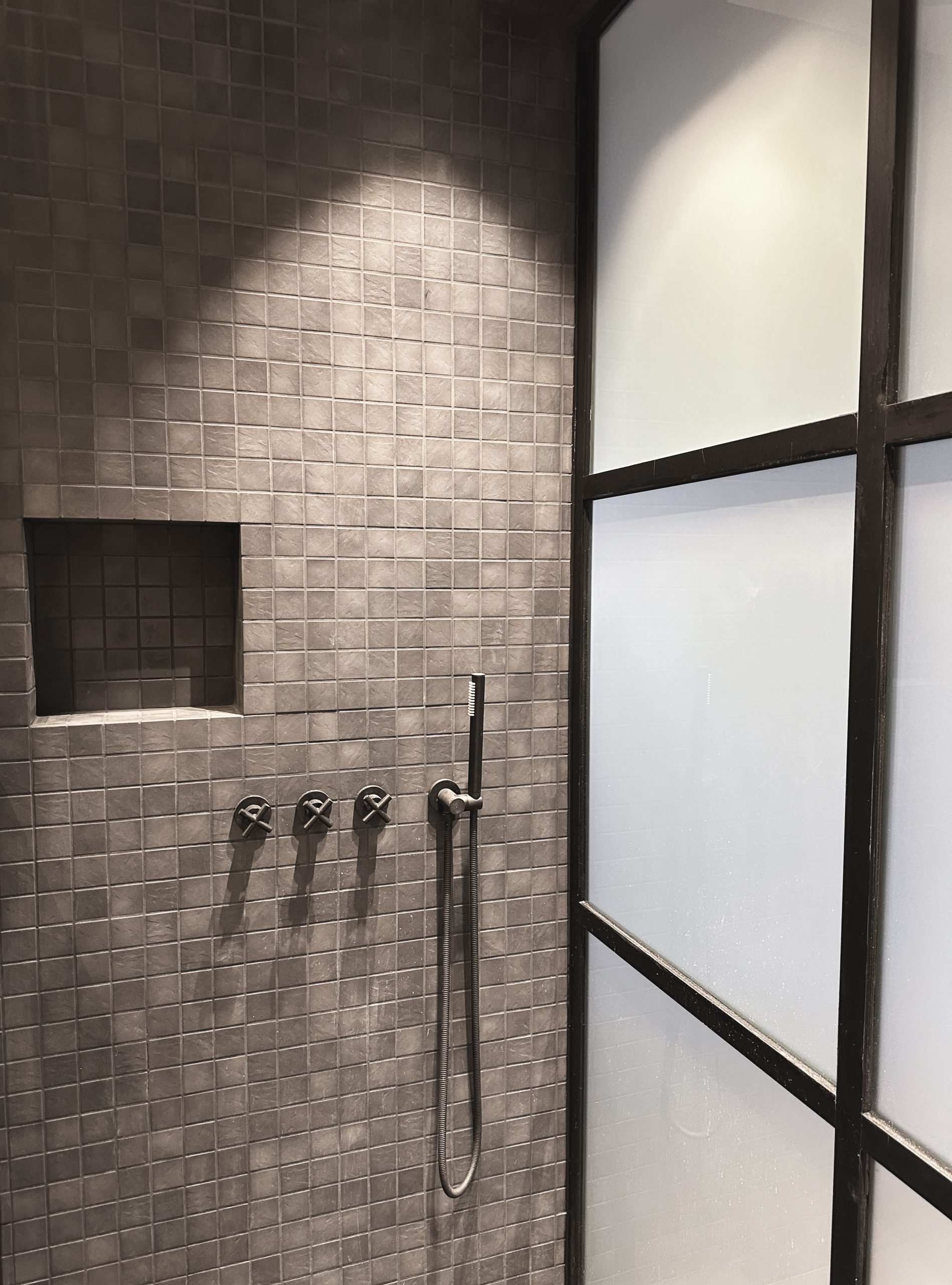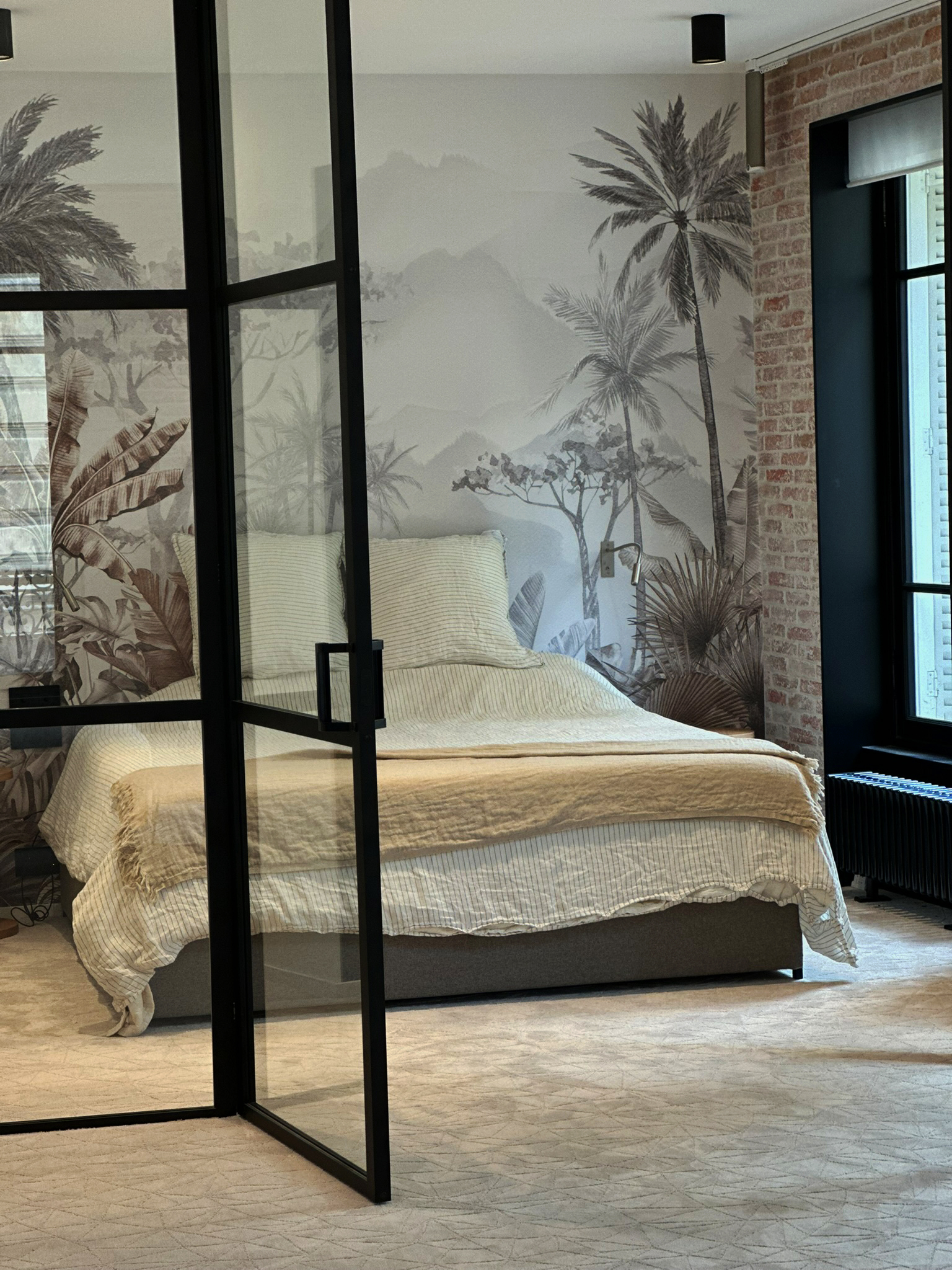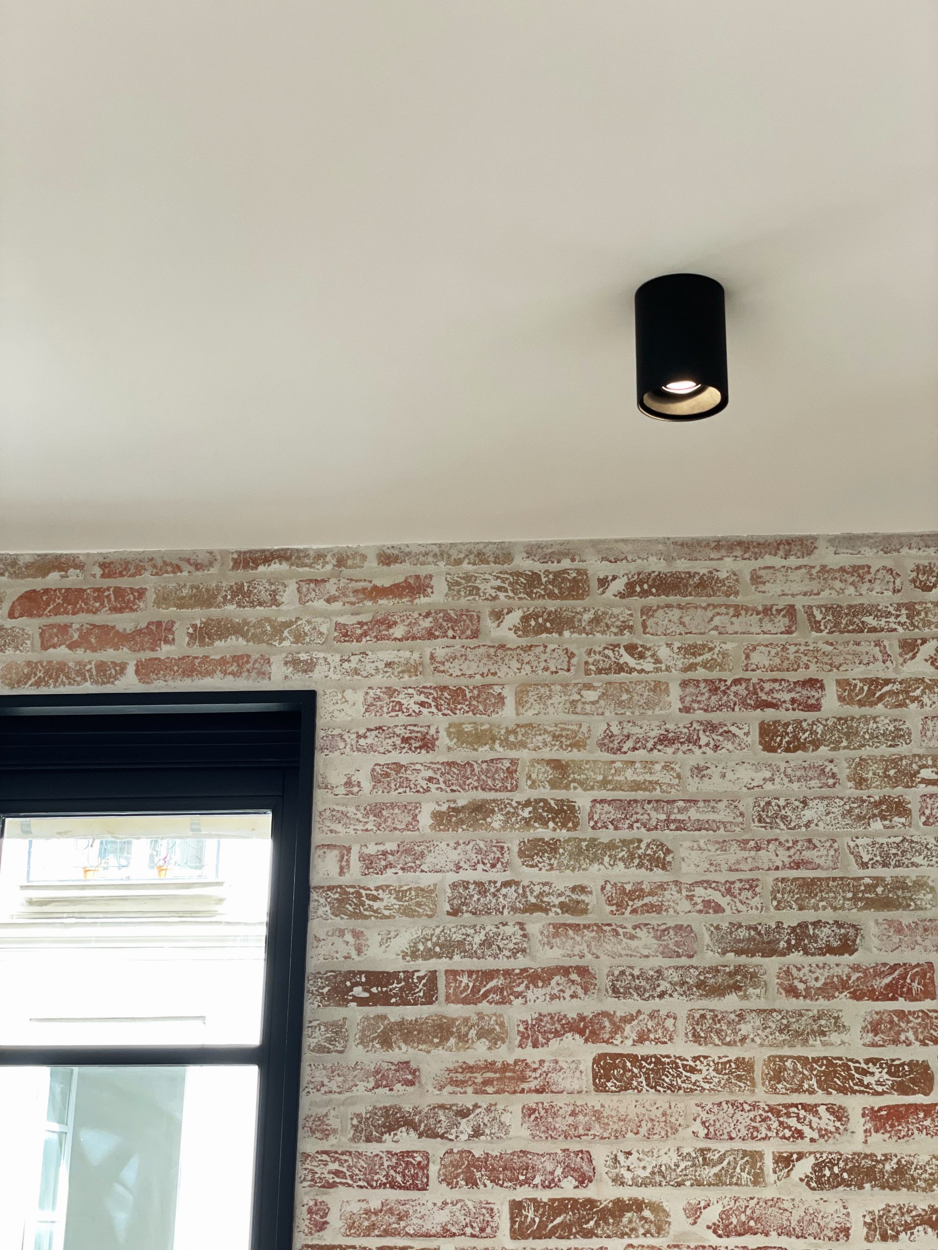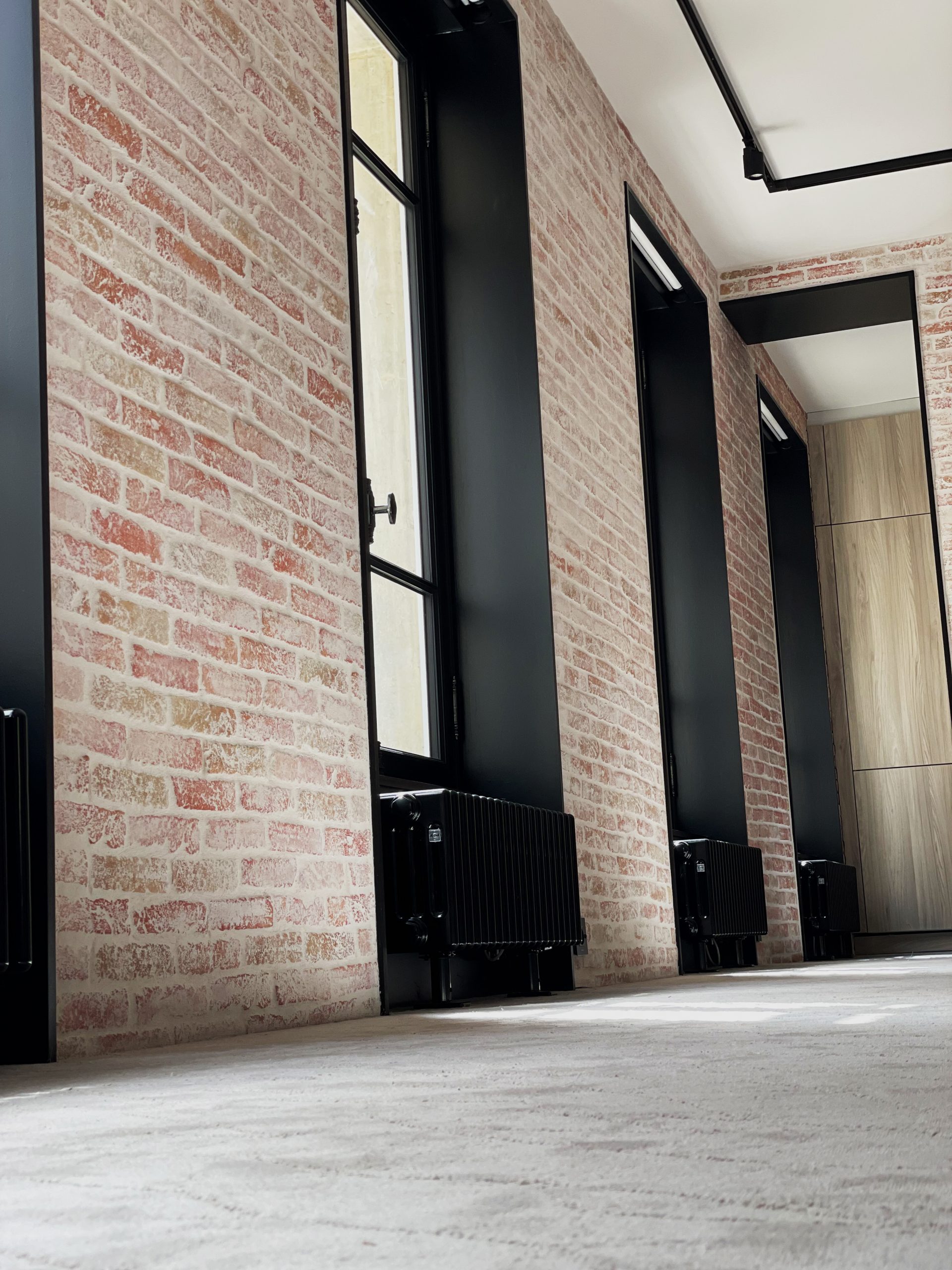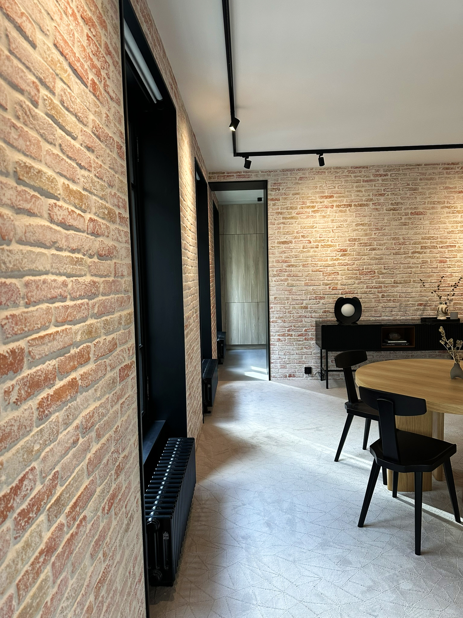 Ce projet mise sur un contraste subtil entre les encadrements noirs des fenêtres et des verrières et la luminosité enveloppante de l’appartement. Les fenêtres et verrières aux cadres sombres créent une dynamique visuelle marquante, structurant l’espace tout en laissant entrer une abondante lumière naturelle.