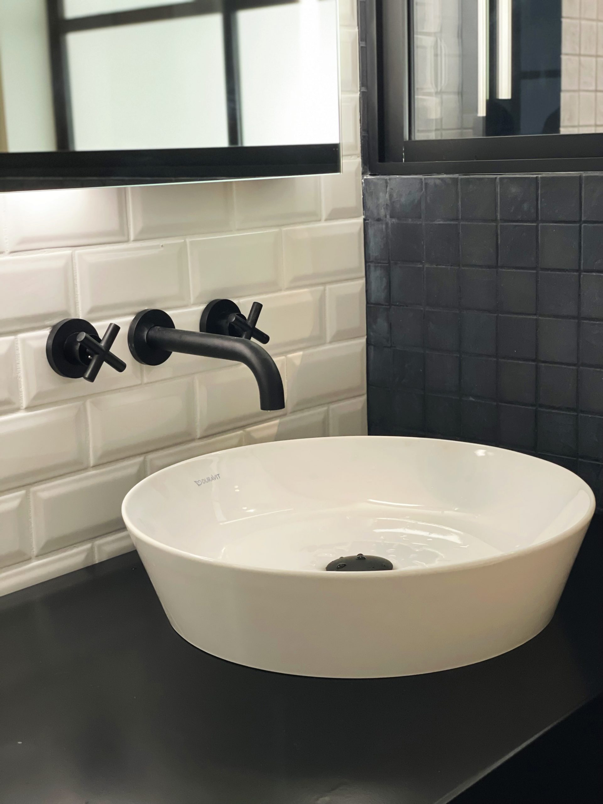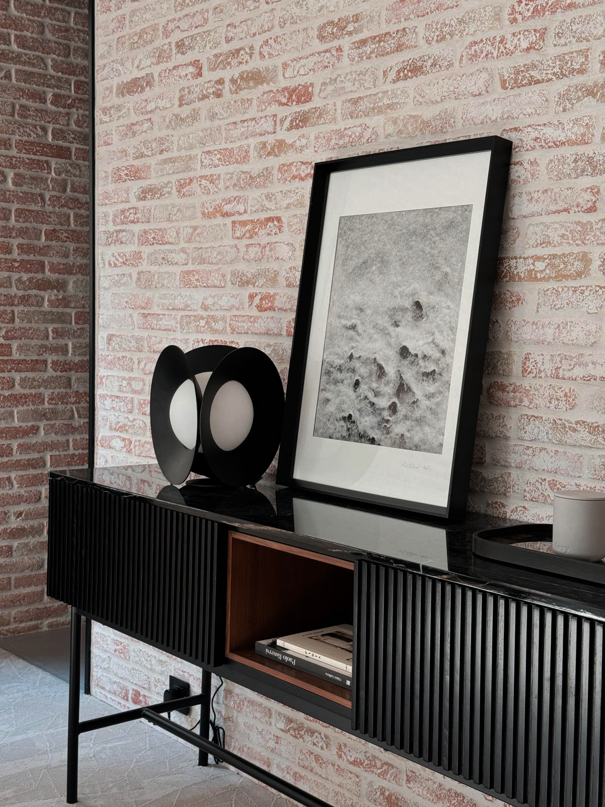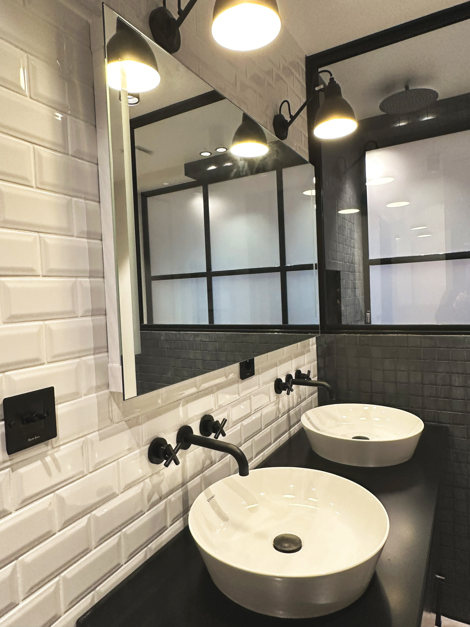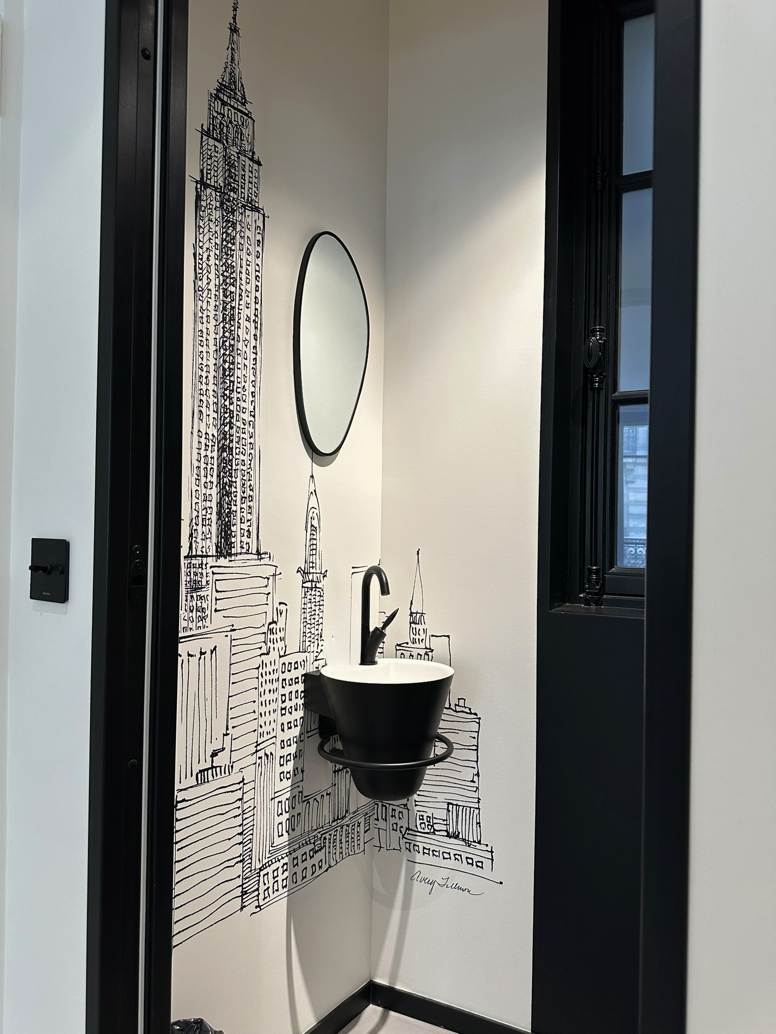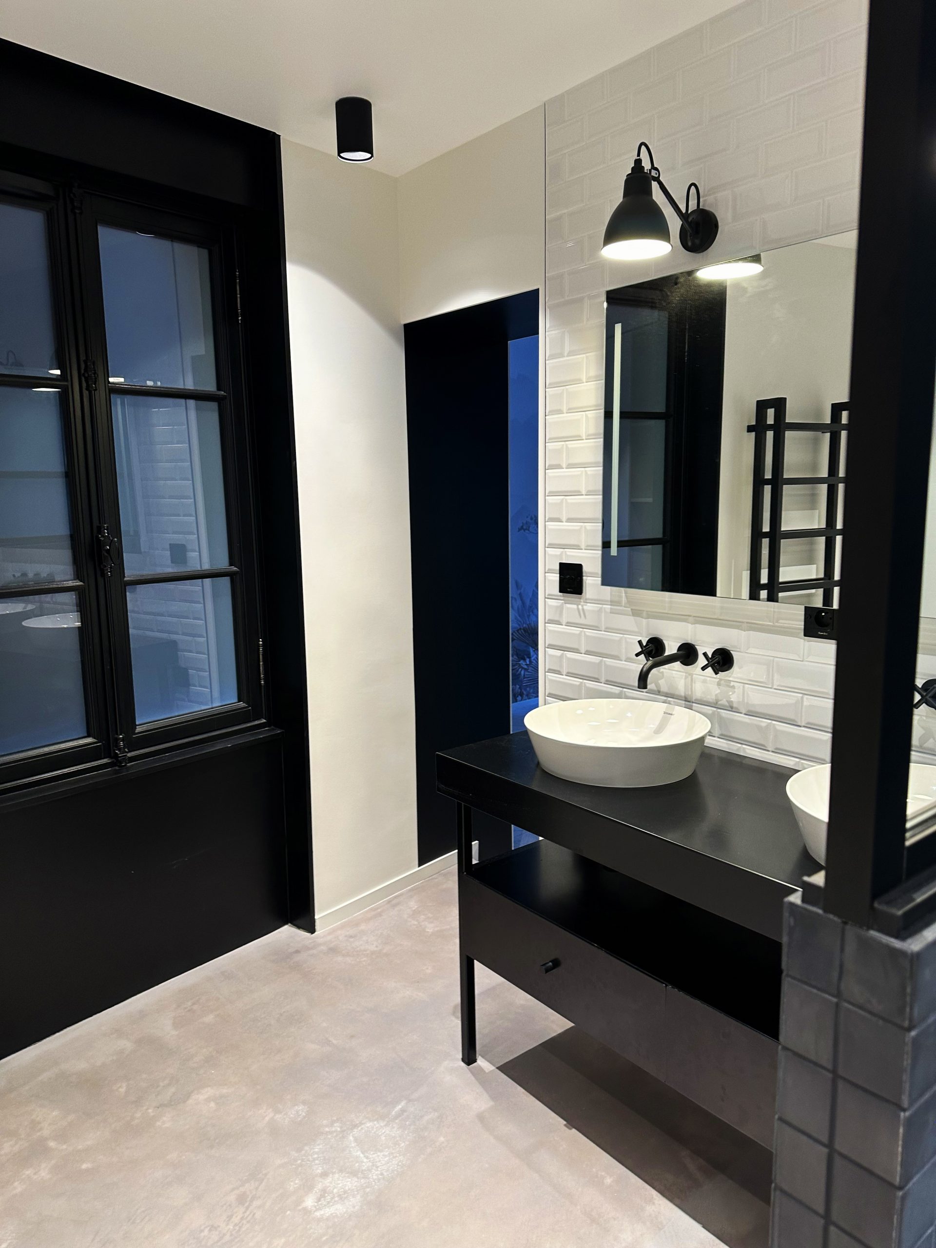 Cette touche de noir souligne les ouvertures et dialogue harmonieusement avec les murs aux teintes claires, qui renforcent l’éclat de l’intérieur. L’association de ces éléments confère profondeur et caractère à l’ensemble, tout en conservant une ambiance lumineuse et raffinée.