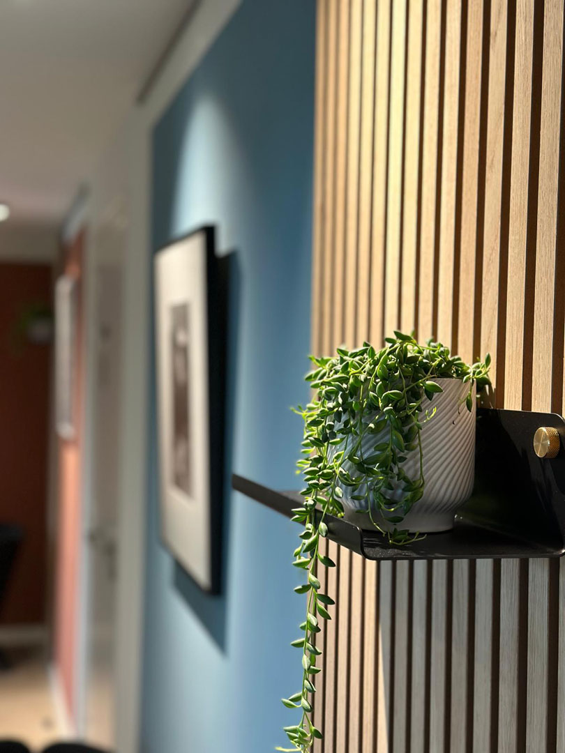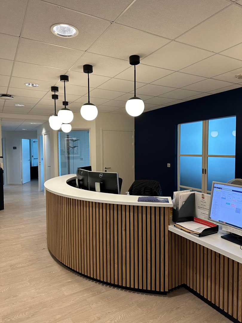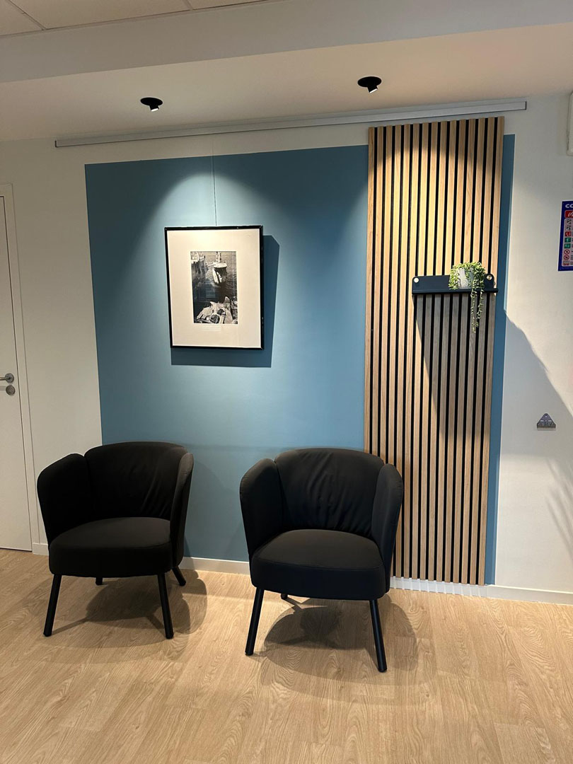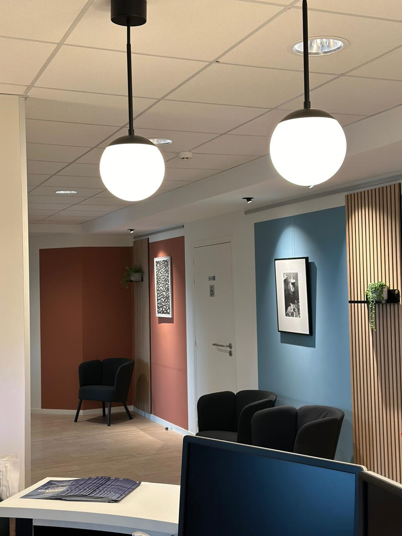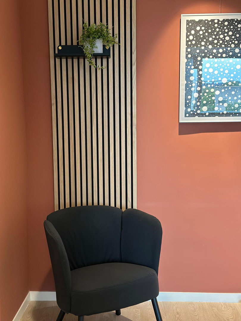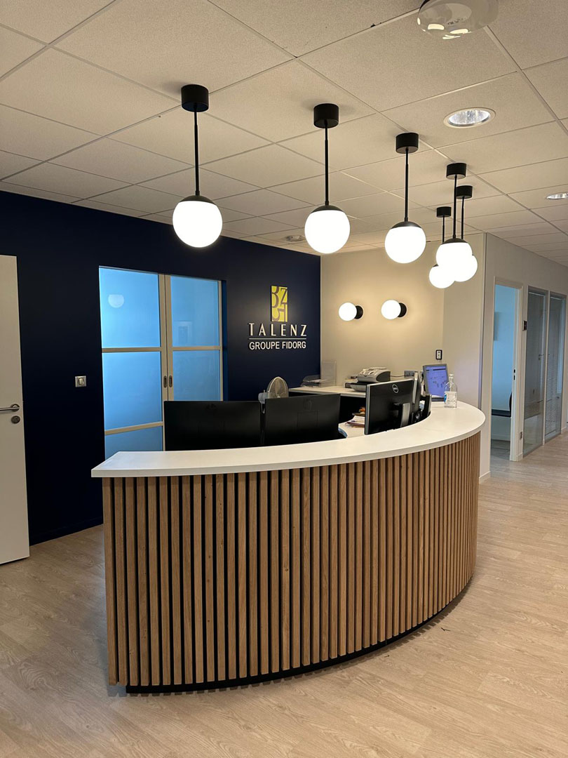 Les bureaux de Talenz se caractérisent par un design qui marie modernité et professionnalisme. Les touches de couleurs vives insufflent une atmosphère dynamique, tandis que le bois au mur ajoute une note chaleureuse.